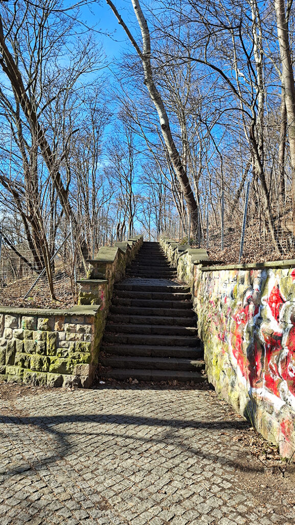 Man kann den Weg der alten Trümmerbahn benutzen oder auch diese Treppen, die über mehrere Etagen zur Aussichts-Plattform führen.