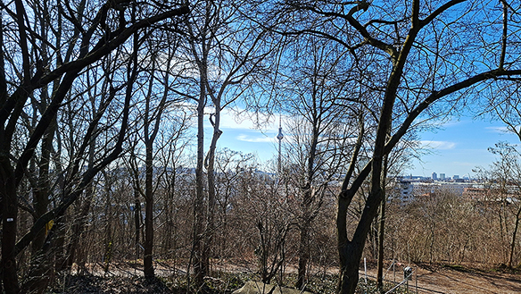 Ausblick von der Aussichts-Plattform in Richtung Alexander Platz mit Blick zum Fernsehturm. Jetzt ist er noch sichtbar, aber wenn alles begrünt ist, muss man ihn suchen.