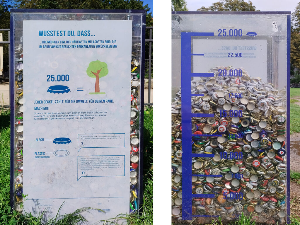 Kronkorken sind der häufigste Müll in Grünanlagen. In Deutschland werden jährlich etwa 22 Milliarden Kronkorken hergestellt. Das sind fast 50.000 Tonnen Metall. Kronkorken können deshalb fast zu 100 Prozent recycelt werden. Für 25.000 gesammelte Kronkorken kann ein Baum gepflanzt werden. Das ist gut für die Umwelt und für nackte Füße auf der Wiese.