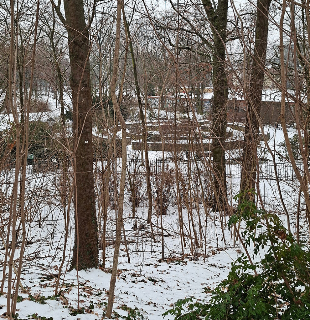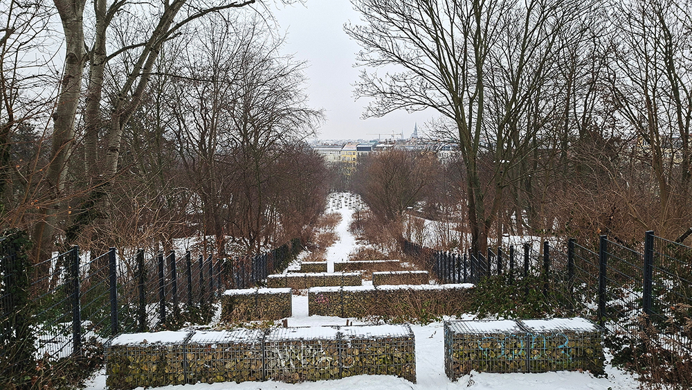 Blick vom Kleinen Bunkerberg zur Straße am Friedrichshain