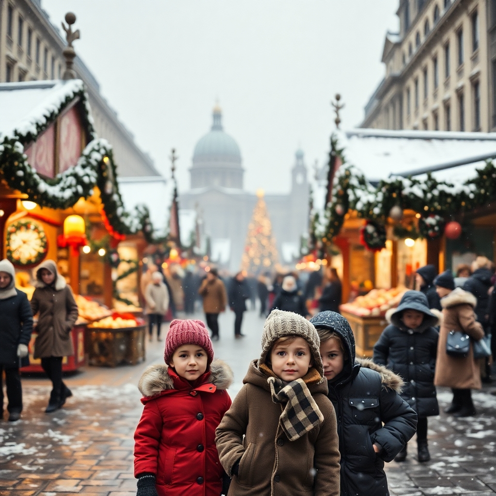 Promt: Create a highly realistic 4k photo of a Berlin Christmas market around 1928 in Kreuzberg at Chamissoplatz. It has snowed. In the foreground, children are standing and looking curiously into the photographer’s camera.
